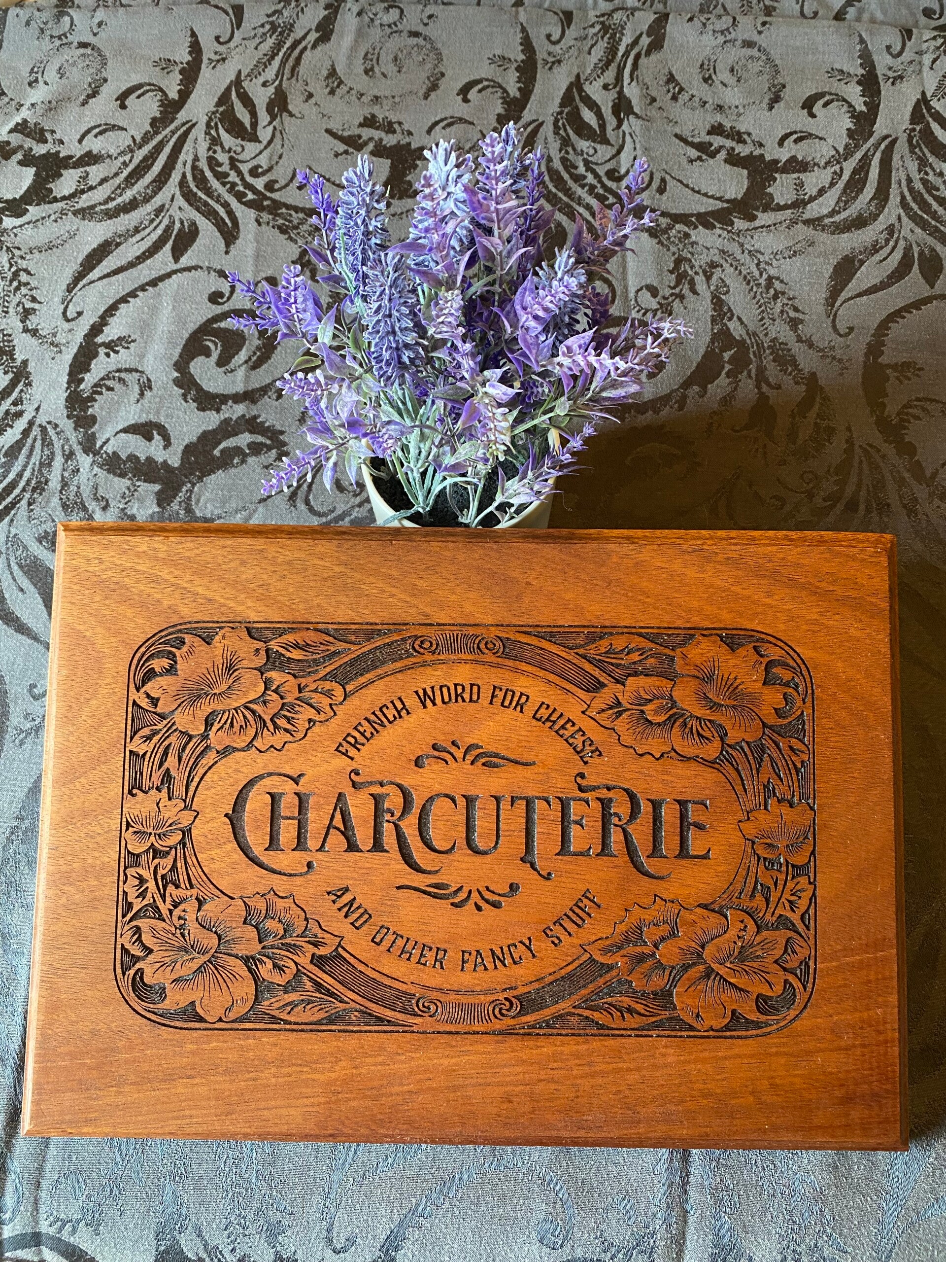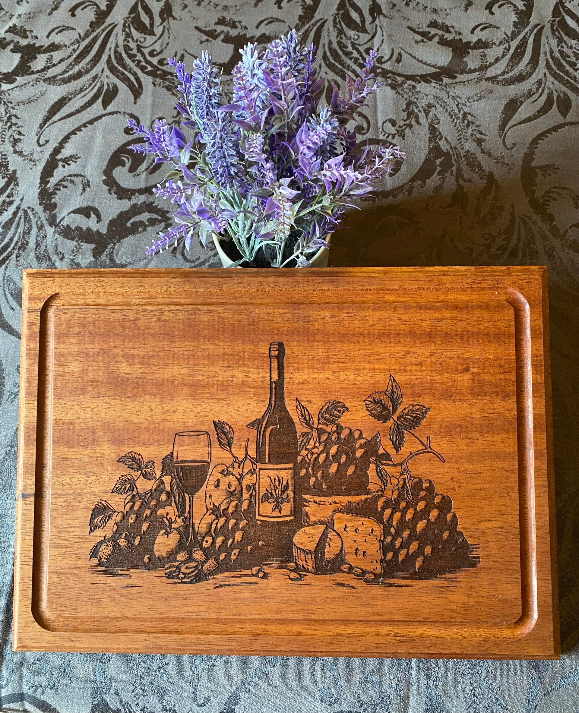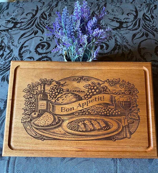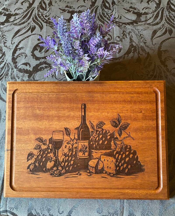Cutting and charcuterie boards are approximately 11 x 15. Engraved on mahogany wood. With or without the juice groove. Sealed with food grade butcher block. They can come with non skid feet or hardware to hang. Customization is available.